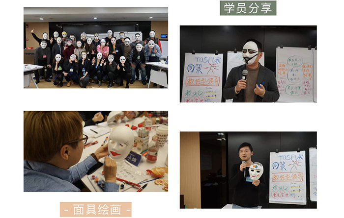 同时,开场面具是此次第二模块中相当具有特色的环节。所有学员完成他们想要展现的外界的面具是什么样的?学员分别分享他们的面具代表什么?当我们带上面具的那一刻,面具下真正的自己又是什么样的呢?一段自我觉察、内观的旅程正式开启......