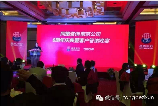 WALKING”南京同策8周年客户答谢宴在金陵饭店钟山厅热烈举行。各大龙头房企的主要领导、媒体界领袖及同策公司集团领导等百余人齐聚晚宴现场,一起见证了南京同策的8年发展历程,一起体验南京同策对同行友人8年厚爱的感激之情,一起感悟南京同策以“专业至上,服务至诚”为宗旨、致力于提供更细致,更专业的综合性服务的良苦用心。
